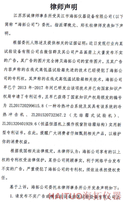 海拓儀器律師聲明:反對侵權(quán)行為 維護公司和消費者權(quán)益摘要:國內(nèi)試驗設(shè)備領(lǐng)先者吳江市海拓儀器設(shè)備有限公司委托律師事務(wù)所發(fā)布了律師聲明,該聲明指出,當(dāng)前市面上出現(xiàn)了產(chǎn)品專利侵犯海拓儀器權(quán)益,海拓儀器將以法律手段維護自身利益。該律師聲明要求某試驗設(shè)備有限公司立即停止侵權(quán)行為,扯下其在網(wǎng)絡(luò)平臺的相關(guān)廣告和宣傳畫冊并同時停止生產(chǎn)同款設(shè)備。如果該設(shè)備公司不聽勸解,海拓儀器將向人民法院依法起訴該公司侵權(quán)行為,以維護自身合法權(quán)益和維護客戶消費權(quán)益,并建議廣大消費者仔細(xì)甄別相關(guān)產(chǎn)品。? ? ? ?近日,吳江市海拓儀器設(shè)備有限公司委托律師事務(wù)所發(fā)布了律師聲明,該聲明指出,當(dāng)前市面上出現(xiàn)了產(chǎn)品專利侵犯海拓儀器權(quán)益,海拓儀器將以法律手段維護自身利益。??事件源起于海拓儀器發(fā)現(xiàn)市面上有同類設(shè)備公司通過完全拷貝海拓儀器產(chǎn)品宣傳圖片,在微信群及該公司產(chǎn)品畫冊上大量發(fā)布不實廣告。??聲明指出,該廣告聲稱的在線式高低溫試驗箱的技術(shù)侵犯了海拓儀器的專利權(quán),該產(chǎn)品專利由海拓儀器 -