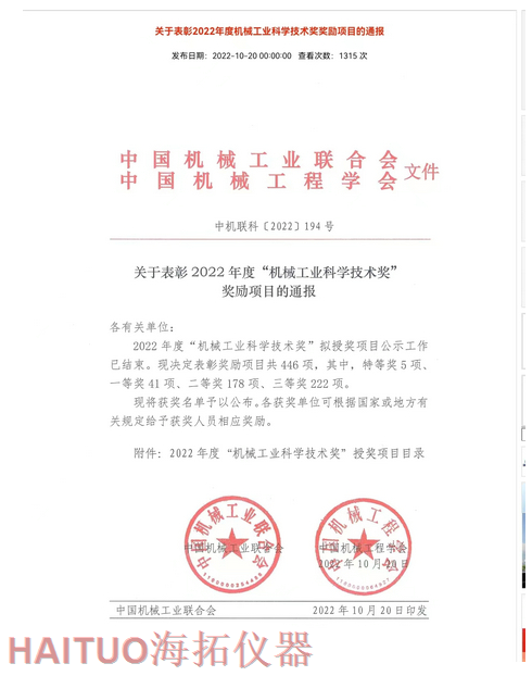 海拓儀器榮獲2022年度中國機械工業(yè)科學(xué)技術(shù)獎?ICC訊?10月20日,2022年度“中國機械工業(yè)科學(xué)技術(shù)獎”項目名錄正式發(fā)布,由海拓儀器(江蘇)有限公司完成的“超快速冷熱沖擊試驗系統(tǒng)關(guān)鍵技術(shù)研究與系列應(yīng)用”項目榮獲2022年度“中國機械工業(yè)科學(xué)技術(shù)獎”三等獎。??據(jù)了解,中國機械工業(yè)科學(xué)技術(shù)獎是根據(jù)《國家科學(xué)技術(shù)獎勵條例》和《社會力量設(shè)立科學(xué)技術(shù)獎管理辦法》的有關(guān)規(guī)定,由中國機械工業(yè)聯(lián)合會和中國機械工程學(xué)會共同設(shè)立并經(jīng)國家科學(xué)技術(shù)部批準(zhǔn),在國家科技獎勵主管部門登記的面向全國機械行業(yè)的綜合性科技獎項。旨在表彰在機械工業(yè)科技工作中作出突出貢獻(xiàn)的單位和人員,獎勵范圍包括:機械工業(yè)科學(xué)技術(shù)發(fā)明成果、機械工業(yè)科學(xué)技術(shù)進步成果、機械工業(yè)工程化和新技術(shù)推廣成果和機械工業(yè)軟科學(xué)和標(biāo)準(zhǔn)成果。??海拓儀器是一家集研發(fā)、制造、貿(mào)易于一體高科技現(xiàn)代化公司,公司成立于2005年,主要產(chǎn)品包括:超快速冷熱沖擊試驗機(熱流儀)、快速溫變應(yīng)力篩選試驗箱(ESS), -